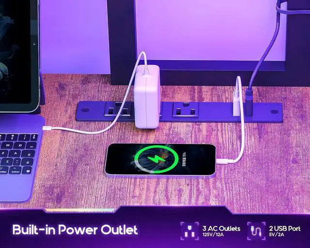 Power Outlets & USB Ports This l shaped desk includes 3 AC outlets and 2 USB ports to power your monitor, gaming gear, and mobile devices. The corner computer desk design keeps everything within easy reach, keeping you charged and focused through long sessions