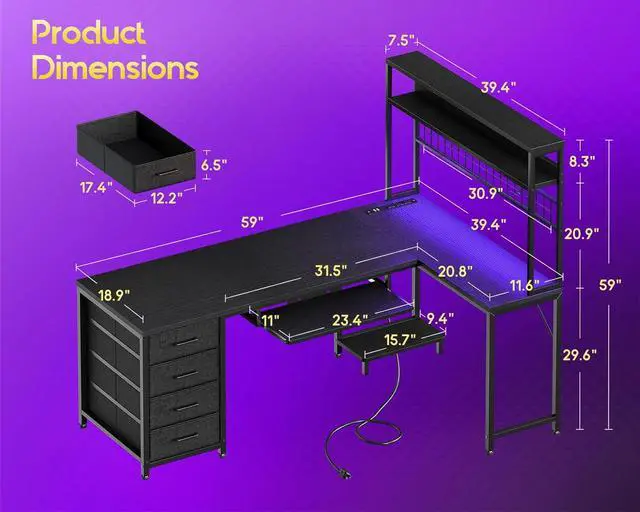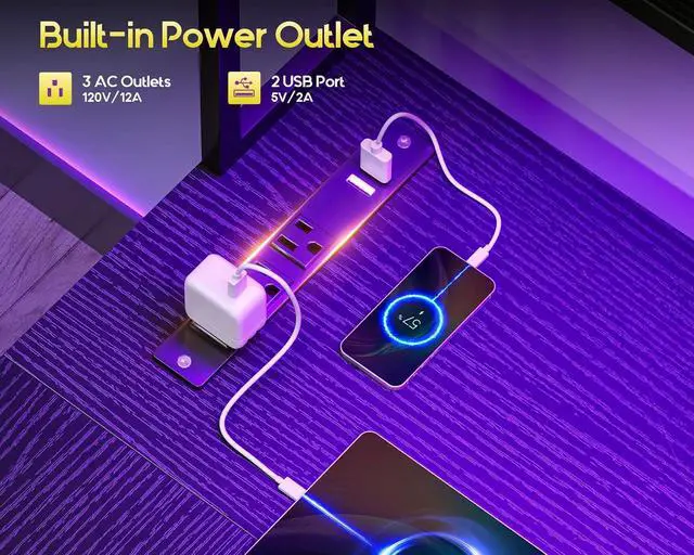 Built-in Power Outlets & LED LightThis office desk with drawers includes a power outlets with 3AC outlets and 2 USB ports for easy charging for your electronic devices. Adjustable LED light strip offers 10 colors and modes via a handy remote. Ideal for creating the perfect ambiance for work or relaxation