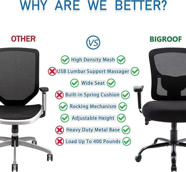 Best for Big and Tall- Bigroof big and tall heavy duty office chairs with a wide seat and extra thickly cushioned about 6" provide you with maximum comfort. Executive chair have commercial-grade components, supports up to 400lbs.