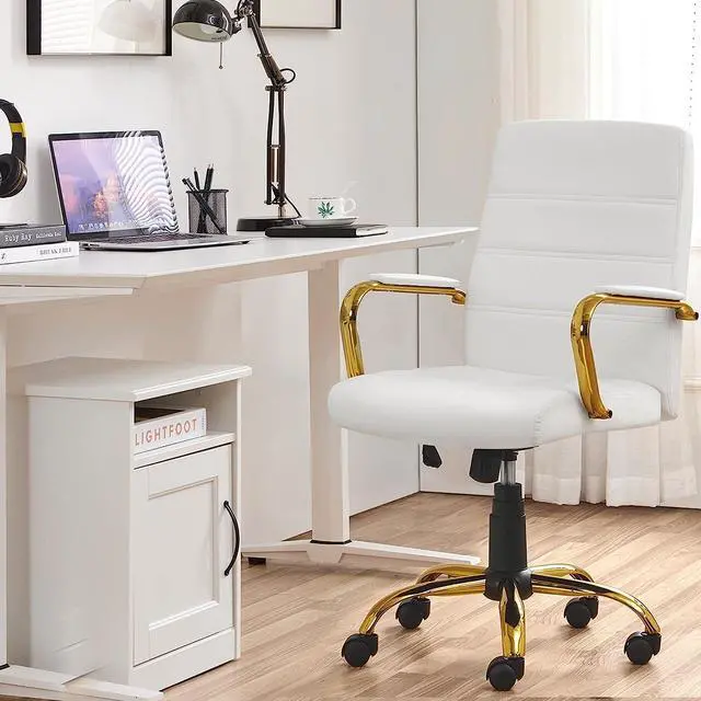 Classic Faux Leather FinishUnlike normal office chairs, this home office chair painstakingly selects smooth PU leather, golden chrome-plated armrests & legs for a luxurious but sleek look. The horizontal stitch on the seat and back creates a comfortable cushioned look.