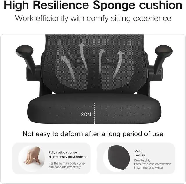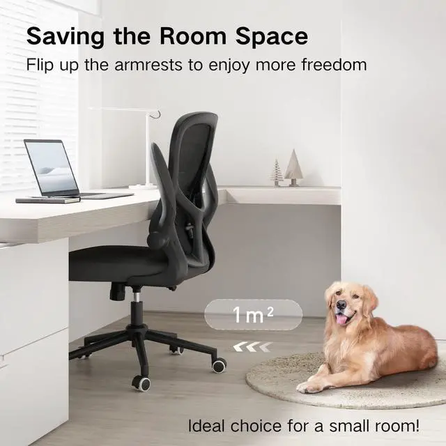 Space-Saving: The mesh office chair is equipped with adjustable armrests. The armrests are wrapped in comfortable mesh and sponge, and the soft wrapping can reduce the pressure on the elbows. The armrest can be flipped up 90 degrees, can save one square meter by gently lifting it up. The office chair design of the flipped armrest can easily change the distance between you and the desk, saving space to the greatest extent. It can be used in living rooms, study rooms, and conferences room etc.