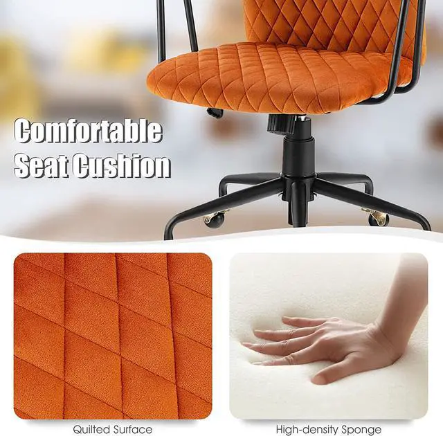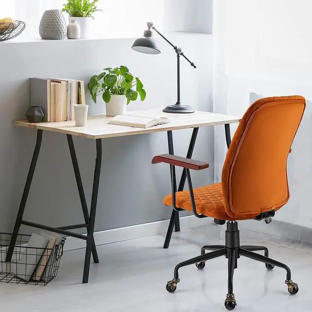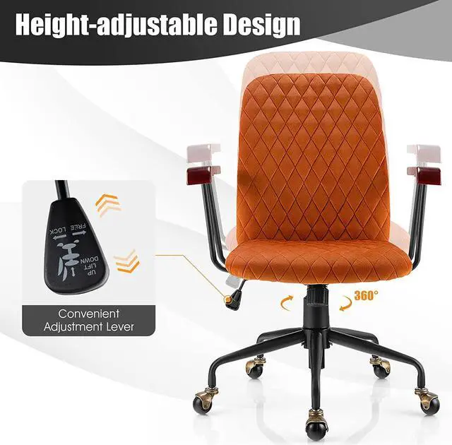 Full of Retro GlamourAdds beauty to your room! The office desk chair features a quilted velvet upholstery that brings an elegant and deluxe appeal. Moreover, the copper casters and rubber wood armrests highlight the vintage style, making the swivel chair a retro addition to your home or office.