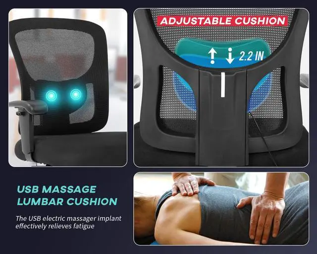 USB Massage Lumbar Cushion - Office chair have excellent breathable mesh design, maintain the air flowing naturally in the desk chair seat area keep the sweat and back were not overheating. Big and tall office chair have heavy-duty metal base with 360-degree swivel and nylon smooth-rolling casters, great stability and mobility.
