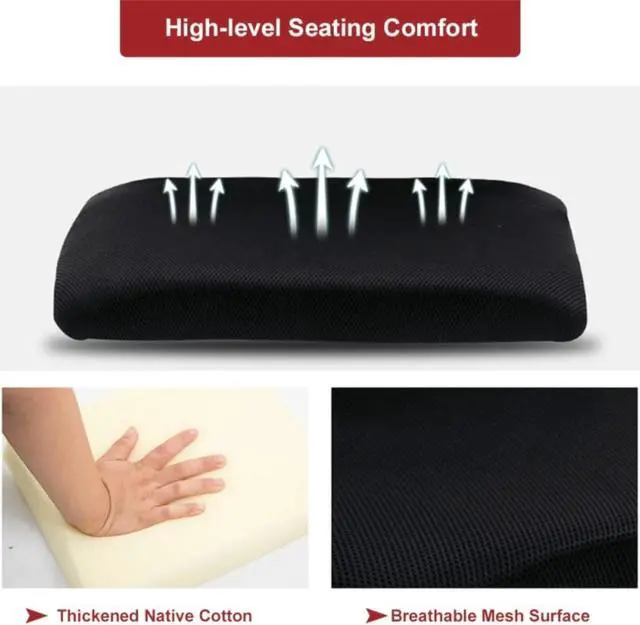 ULTIMATE SITTING EXPERIENCEBreathable and resilient padded thick office seat cushion. Ventilated office chair seat cushion prevents sweating from long seating. Air circulation to keep you cool while leaning. Elastic foam with comfort chair. Armrests support your ARMS position with ergonomic stability. Extra lumbar support for your lower desk chair back support. Curve along the waistline feel like hands on waist.