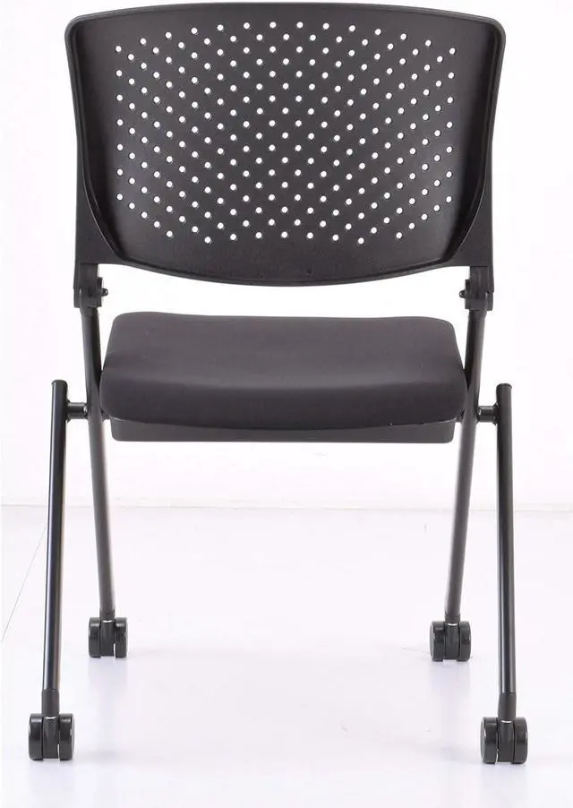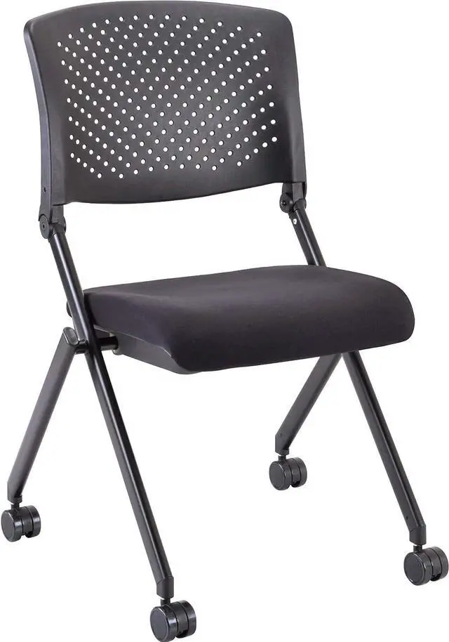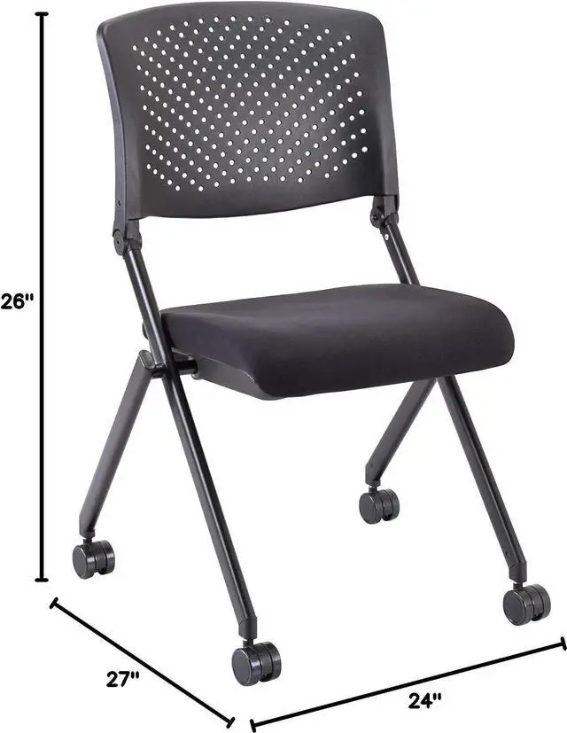 Convenient seating for guests and training participants Nesting design for compact storage Mobile on nylon casters for easy setup Fabric-upholstered seat for comfort 360-degree swivel rotates completely for added convenience