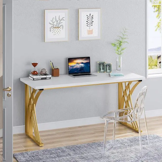 LITTLE TREE 55 Large Modern Computer Desk, White & Gold Luxury Laptop PC Student Table, Makeup Vanity Table with Thick Frame & Strong Legs, Sturdy Writing Workstation for Home & Office