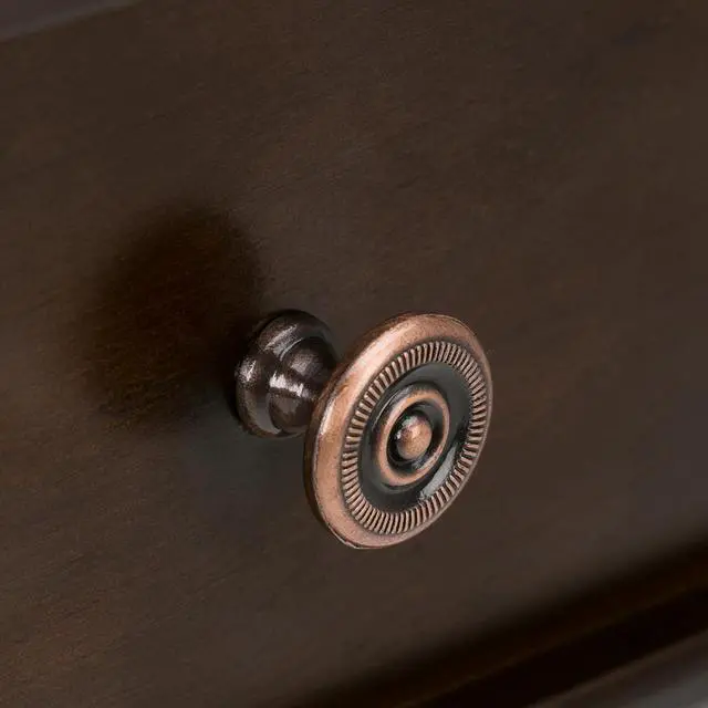 Features flip down drawer front reveals an internal keyboard tray and bronze rounded knobs
