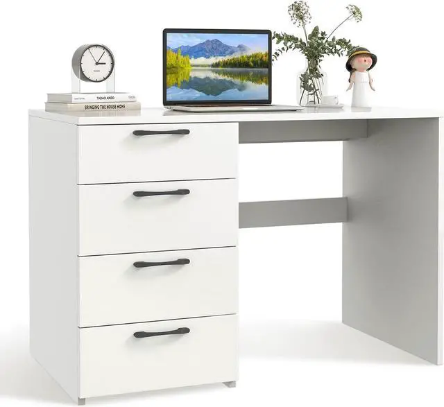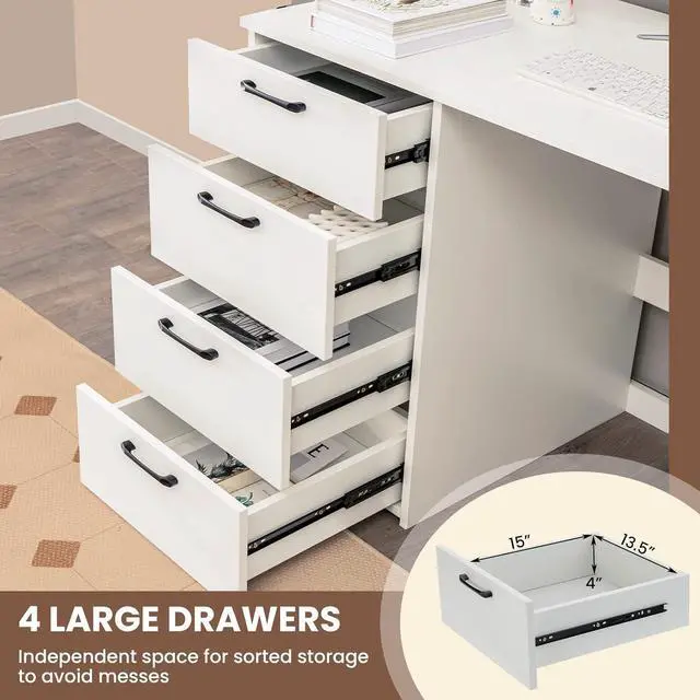 [4 Deep Drawers for Sundries]: The home office desk has 4 drawers of 13.5 " x 15" x 4" (L x W x H) to meet sorted storage with ideal privacy. Slightly pull the metal handles, you will find that the inner space is perfect to keep notebooks, paperwork or office supplies within reach, further improving the working efficiency.