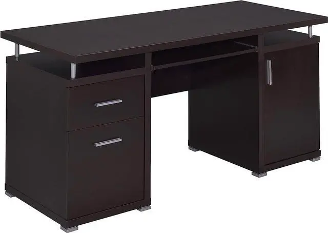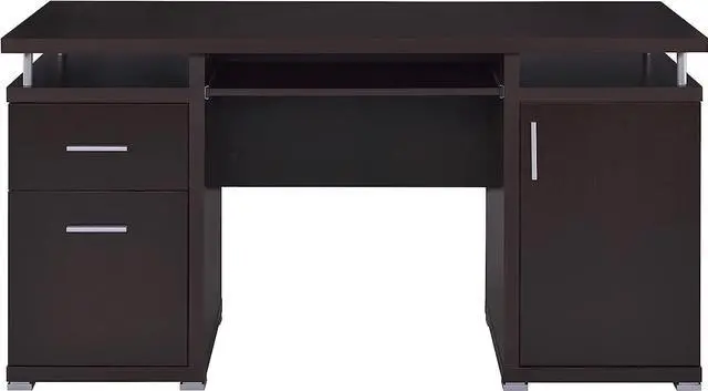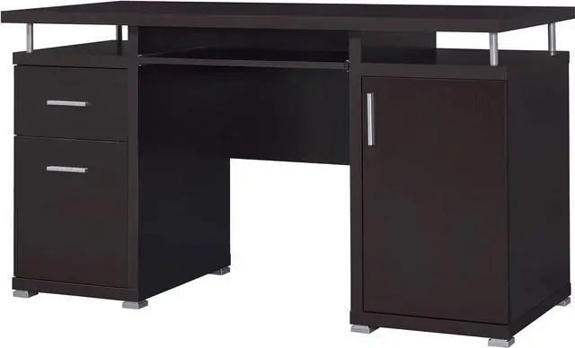 Set includes: One (1) office desk Finish: Cappuccino Materials: Metal, MDF, particle board and laminate Overall computer desk dimensions: 29.5 " H x 55" W x 23.5 " D Assembly required: Yes