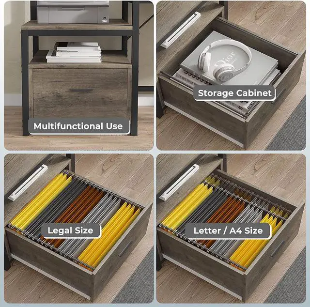 Ample Storage SpaceComing with a file drawer, printer cabinet and 2 tier storage shelves, with powerful storage space. File cabinet can hold letter /A4/ legal size files. This solid constructed L shaped computer desk could hold printers, scanners, fax machines and any other office machines, keeps printer or scanner within easy reach of your desk to free up work space. CPU stand protects the host from moisture and dust. This L shaped computer desk is economic, meets different storage need.