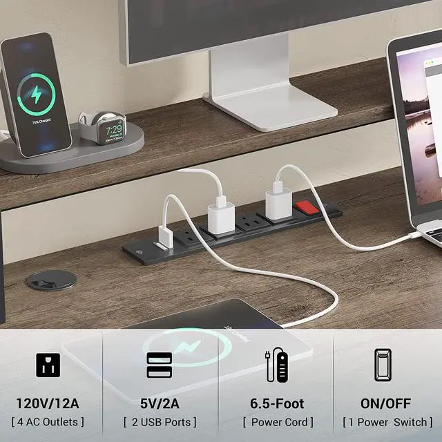 For HealthThe monitor shelf conforms to the ergonomic structure, which effectively reduces the pressure on the back and neck, so that you don't need to worry too much about health problems when you were working. At the same time, a headset hook is provided on the side, so that the headset is at your hand, and you don't need to worry about finding headphones for playing games. Our charging station includes 4-Outlet & 2 USB Ports to provide power for up to 6 devices simultaneously.