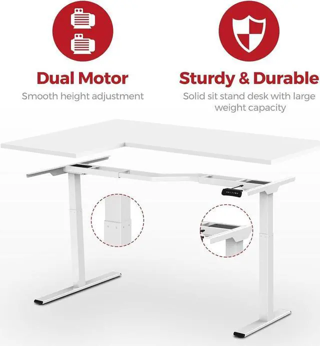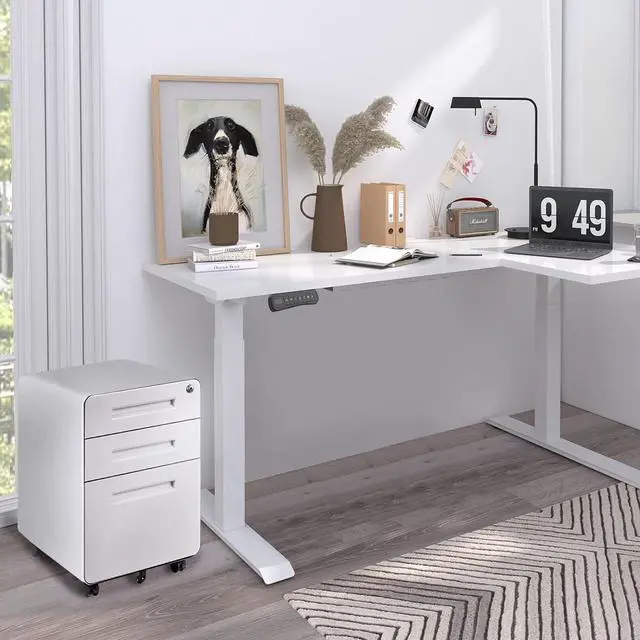 Dual Motor L-Shaped Electric Standing Desk Height Adjustable Stand up Desk with 3 Drawer File Cabinet,63 x 40 Inches White Top/White Frame