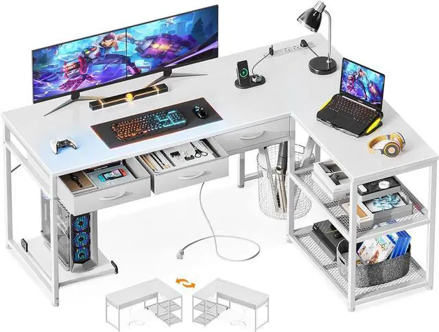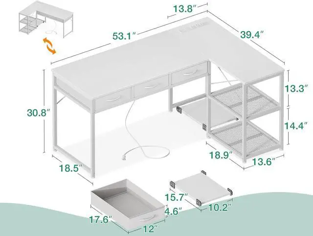 Large Storage Capacity Desk with DrawersThis L desk is designed with 3 easy to assemble fabric drawers that give a nice amount of storage for everything else you need during your work day or study day. The 3 storage drawers can stash things away. Perfect for placing your documents, office or school supplies, gaming equipment etc. You will always have an organized desktop after owing it.