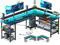 Gaming Desk with LED LightsThis l shaped desk with shelves features built-in LED lighting in 10 colors, 10 lightning modes to create an immersive gaming atmosphere. It has memory function to keep the LED lights staying on last mode when turned on.