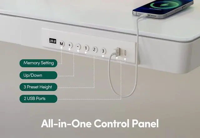 Integrated Controller: The controller is embedded in the glass standing desk top, avoiding the trouble of drilling holes by yourself. USB ports makes charging easier, and with 3 memory settings, you can adjust to the best height with one click.