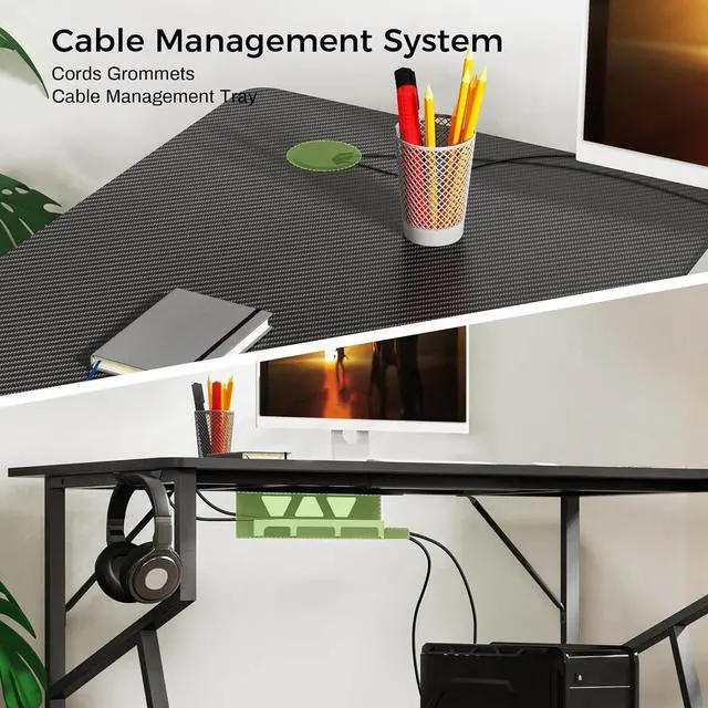 Cords Management System: Two cords management grommets on the desk plus power socket box under the desk, large computer desk could handle all the mixed cords so easily.