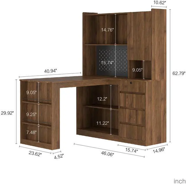 Large Working Space This L-shaped computer desk offers adequate working space. The wide desktop can hold many office supplies, such as monitors, table lamp, books, files, etc. Lower shelf is the ideal place to set printer, multiple monitors, plants. This computer desk is suitable for study room, bedroom, living room and office.