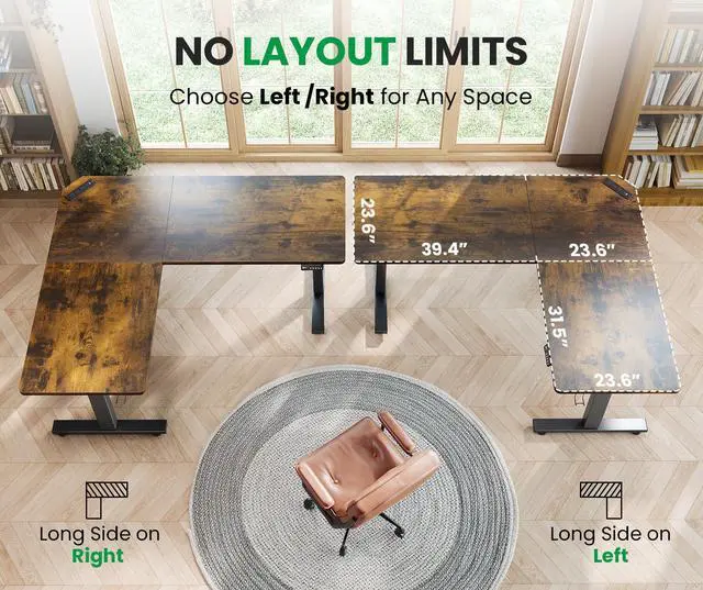 Transform any corner into a command center with the SIAGO L-Shaped Electric Standing Desk. The wide dual-panel design surrounds you with room for dual monitors, laptops, and daily essentialswithout feeling cluttered. With a whisper-quiet lift range of 27.5"45.7", you can switch from focused sitting to energizing standing in seconds, relieving shoulder and back strain. The reversible L-shape fits perfectly into any room, while built-in AC outlets and USB ports keep all your devices powered and cords under control. From morning work sessions to late-night gaming, this desk adapts to your schedule and keeps you performing at your best.