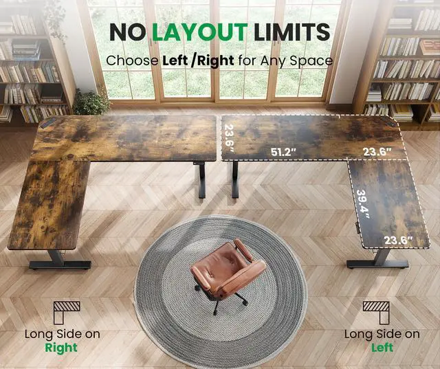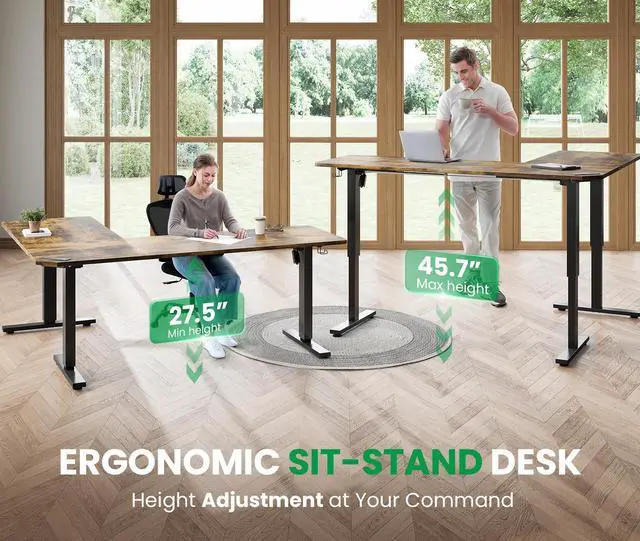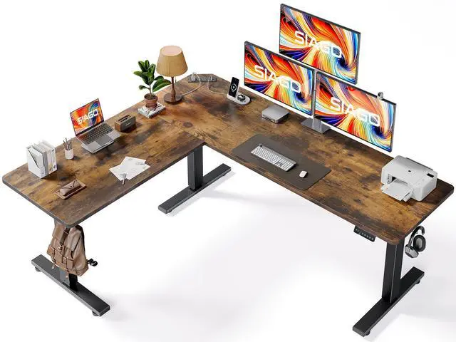 Transform any corner into a command center with the SIAGO L-Shaped Electric Standing Desk. The wide dual-panel design surrounds you with room for dual monitors, laptops, and daily essentialswithout feeling cluttered. With a whisper-quiet lift range of 27.5"45.7", you can switch from focused sitting to energizing standing in seconds, relieving shoulder and back strain. The reversible L-shape fits perfectly into any room, while built-in AC outlets and USB ports keep all your devices powered and cords under control. From morning work sessions to late-night gaming, this desk adapts to your schedule and keeps you performing at your best.