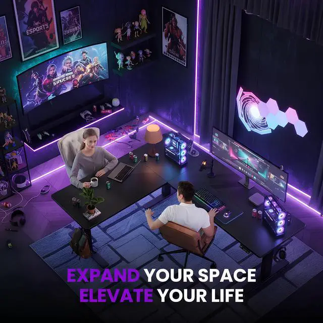Transform any corner into a command center with the SIAGO L-Shaped Electric Standing Desk. The wide dual-panel design surrounds you with room for dual monitors, laptops, and daily essentialswithout feeling cluttered. With a whisper-quiet lift range of 27.5"45.7", you can switch from focused sitting to energizing standing in seconds, relieving shoulder and back strain. The reversible L-shape fits perfectly into any room, while built-in AC outlets and USB ports keep all your devices powered and cords under control. From morning work sessions to late-night gaming, this desk adapts to your schedule and keeps you performing at your best.