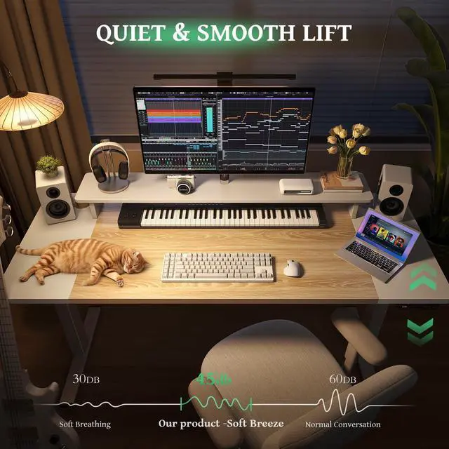 Built to handle up to 200 lbs, this gaming desk gives you the rock-solid stability every player needs. With one-touch height adjustment, you can switch between sitting and standing modes seamlessly, keeping your energy high during long sessions. The ultra-quiet motor operates under 45 dB, so your focus stays on the gamenot the noise. Integrated cable management keeps your setup clean and distraction-free, while the spacious desktop provides room for dual monitors, consoles, and peripherals. Engineered for esports, streaming, or casual play, this desk combines durability, performance, and style to upgrade your battle station.