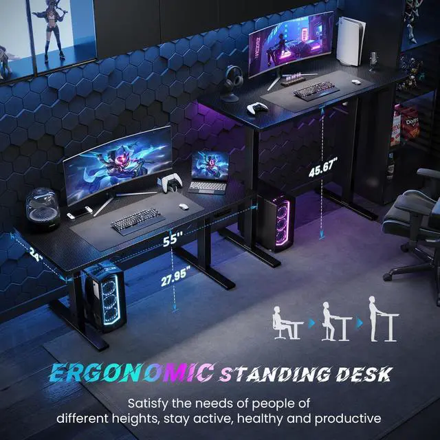 Built to handle up to 200 lbs, this gaming desk gives you the rock-solid stability every player needs. With one-touch height adjustment, you can switch between sitting and standing modes seamlessly, keeping your energy high during long sessions. The ultra-quiet motor operates under 45 dB, so your focus stays on the gamenot the noise. Integrated cable management keeps your setup clean and distraction-free, while the spacious desktop provides room for dual monitors, consoles, and peripherals. Engineered for esports, streaming, or casual play, this desk combines durability, performance, and style to upgrade your battle station.