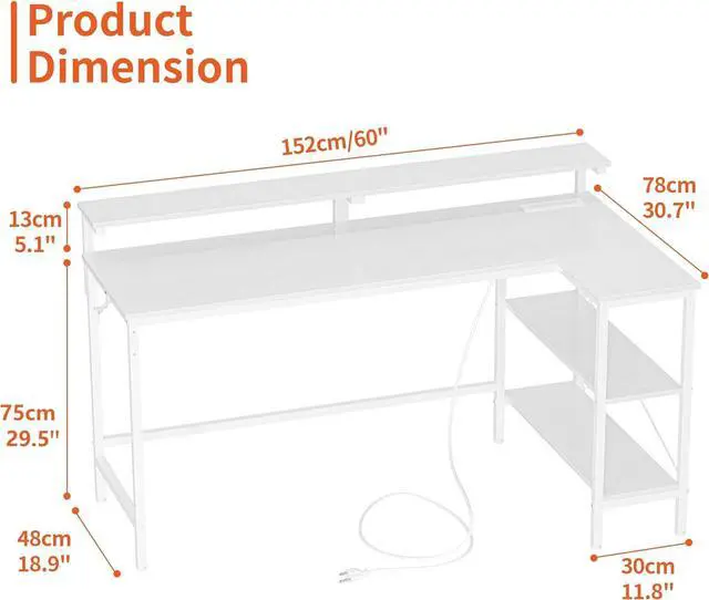 Abundant Storage Space & Easy Installation The 60 inch gaming desk is designed to increase storage space, and the main desktop length is 60", which is larger than other common L tables. The wide table on the side can keep your documents, books and other necessities within reach. Equipped with a detailed installation guide to ensure smooth installation.