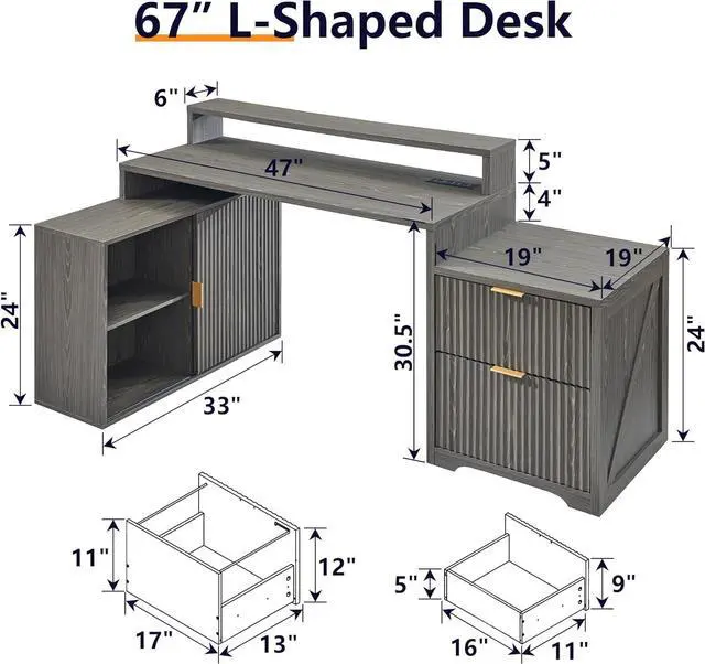 Ample Storage Space: our L-shaped desk is Crafted with a harmonious blend of form and function. It boasts two generously proportioned drawers, designed to effortlessly glide open, revealing ample storage for your documents, stationery, and other essentials. A dedicated storage cabinet extends the desk' s utility, offering additional room for larger items or files that require a more permanent home. The cabinet' s presence is both practical and aesthetically pleasing, adding a layer of sophistication to the overall design.