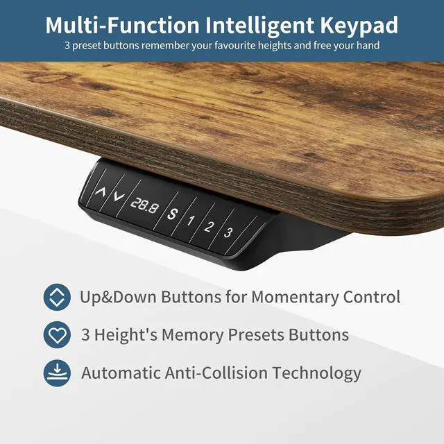 Memory Height and Non-Slip Technology: The standing desk has 3 programmable memory height buttons. If the motorized table encounters an obstacle while raising or lowering, it will move 2 centimeters in the opposite direction to avoid possible damage or injury.