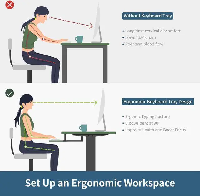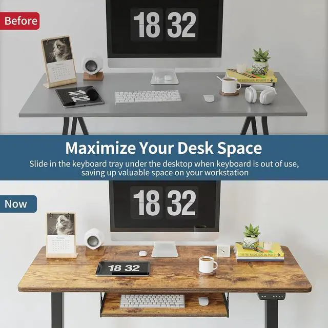 Exclusive Keyboard Tray and Hooks: The standing desk is equipped with a special slide-out keyboard tray that provides extra space for keyboard, mouse or small items. Hooks (2) are also provided under the table. You can enjoy a bigger and neater desktop space!