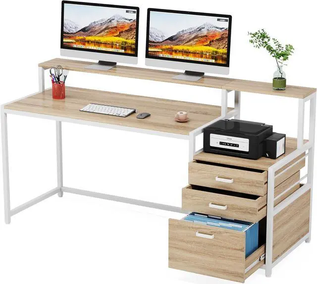 [TWO-TIER TABLETOPS]: Featuring with 62.99 long monitor riser and 45W X 19.68D desktop, this desk with drawers provides ample space for several monitors, laptops or other must-have office essentials, giving you spacious and free workstation space for your office activities, like working, studying, gaming, and etc.