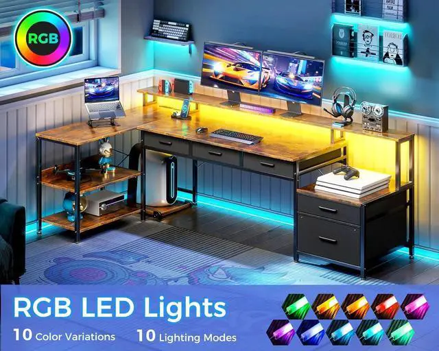 Cool LED Lighting: The l shaped gaming desk offers a wide range of options for LED lights, including 7 colors, 13 modes, 8 adjustable brightness levels, and 9 flicker frequencies. With its memory function, it will remember the last mode used when turned on. Choose your preferred color and mode to start the game.