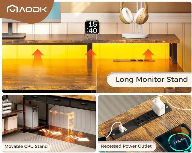 Convenient Charging & Monitor StandThe l shaped desk with power outlet features 3 standard plug outlets and 2 USB ports, providing convenient charging for your laptop, phone and gaming devices. The long monitor stand protects your neck and spine health and also creates extra storage space for your items.