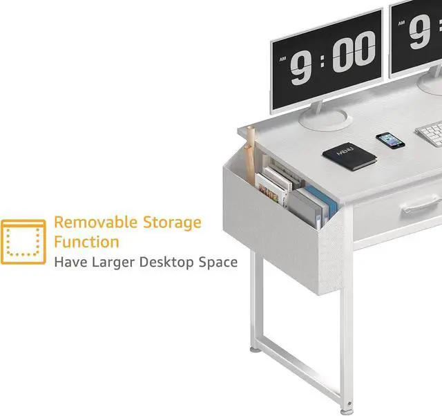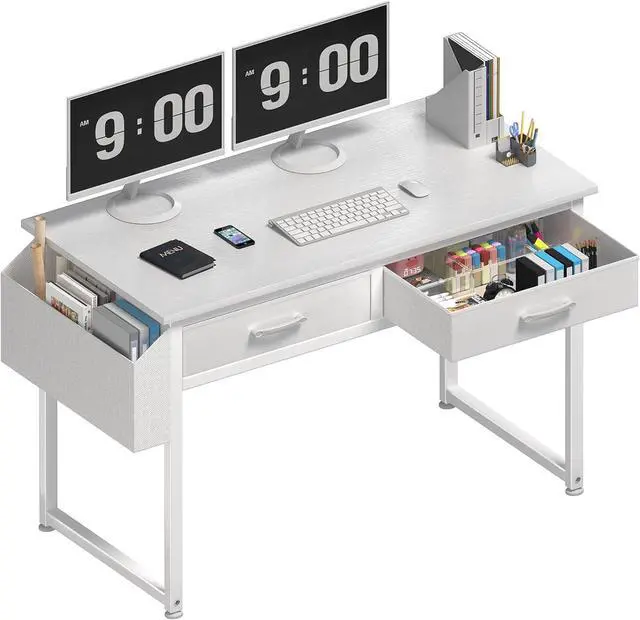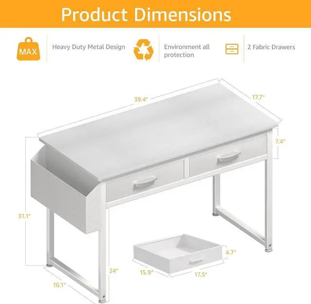 Modern Simple Style Design: Computer desk with 2-tier open fabric drawers for storage, providing plenty of room for under-desk storage and organization. This splice board desk is made of thick P2 particle wood board with scratch-resistant, anti-collision and waterproof, protect home office desk surface from daily wear and tear.