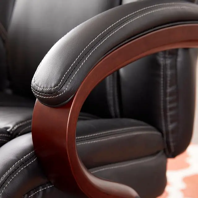 EXECUTIVE STYLE: Brown bonded leather upholstery and darkly stained wood complement any classic office space