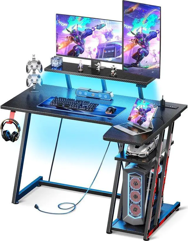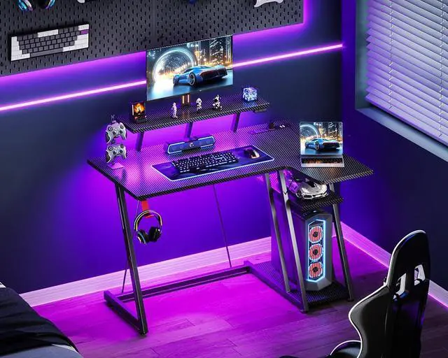 MOTPK Small Gaming Desk with LED Lights & Power Outlets, 39 Inch L Shaped Gaming Computer Desk with Storage Shelf, Gamer Desk with Monitor Stand, PC Gaming Table with Carbon Fiber Texture, Black