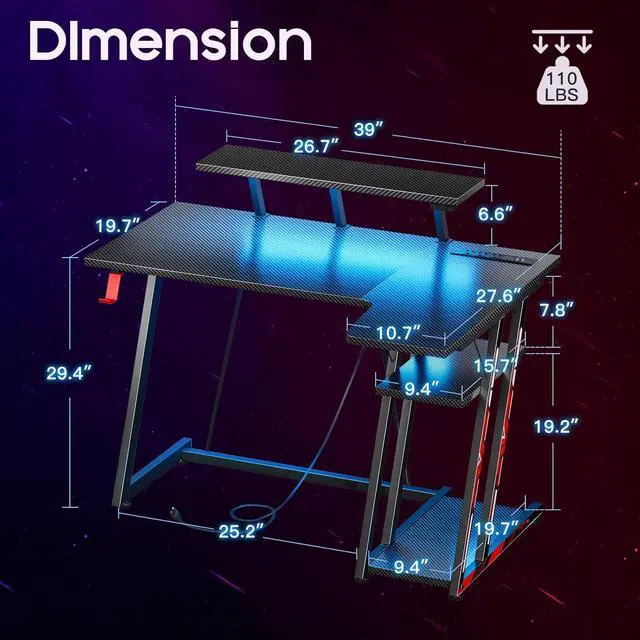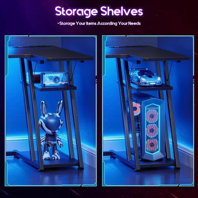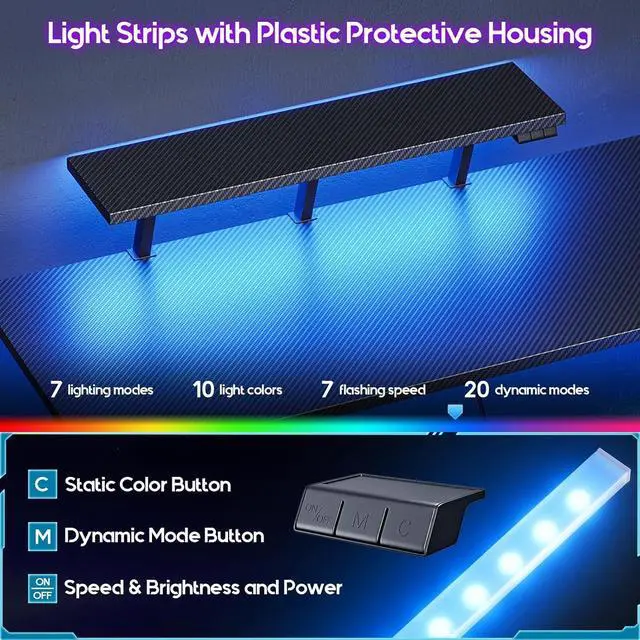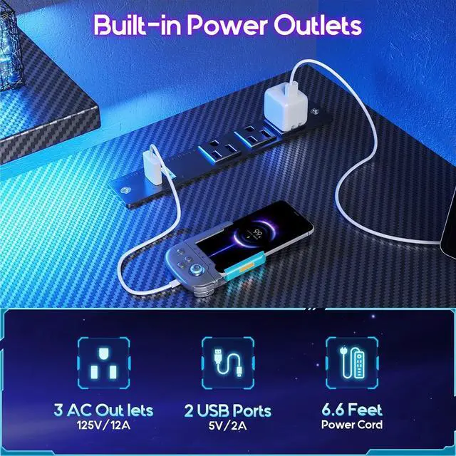 LED Strips Lights & Power Outlets: MOTPK LED gaming desk developed high-quality LED Strips to bring gamers the best gaming accessories: multi-color, multi-mode, and anti-fire. Our PC gaming desk includes a built-in socket with 2 outlets & 2 USB Ports to charge your devices for small space.