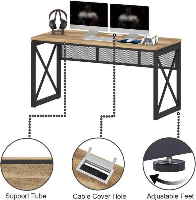 • Not Wobbles at All: Heavy duty metal x-shaped legs and support mesh frame on the back, add an extra support tube under thick desktop makes this industrial computer desk super strong and sturdy. Besides 4 pcs adjustable feet will strengthen the stability and keep balance. Weight Capacity of desktop is 250 LBS.
