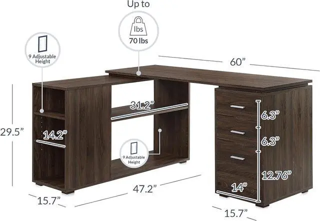 [VERSATILE SETUP] This L shaped desk can be positioned with the L shape facing left or right, so you can decide what best fits your space. The shelves can be adjsuted to suit your knees with 9 heights. Assembly will take under 60 minutes and all hardware is included.