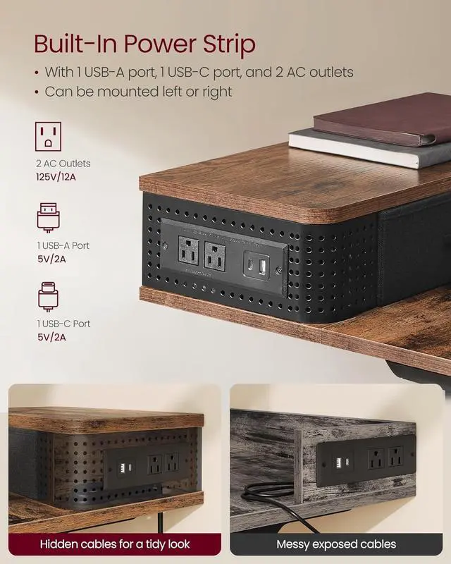 [Adjust. Store. Charge. ] The middle shelf can be adjusted in height as needed. 2 drawers provide space for small items, while the perforated panels keep cables organized. 2 AC outlets, 1 USB-A port, and 1 USB-C port conveniently charge your devices