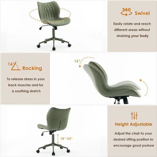 Swivel & Rocking The seat of this comfy desk chair with wheels can be rotated 360° to save space and give you a more comfortable home office. The office chair can be adjusted to a 21-degree reclined position by pulling out the handle located on the base. This posture is ideal for leisure activities such as reading, relaxing, or playing games