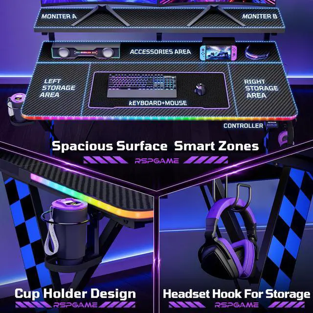 The RSPGAME Basic 43" Music Sync LED Gaming Desk helps you build the ultimate battle station. It features dynamic RGB LED strips for immersive lighting, a convenient cup holder and headset hook to stay organized, and an ergonomic monitor stand to reduce neck strain. Supported by a robust and stable frame, this desk reliably holds your entire setup while enhancing your gaming experience with both style and smart functionality.