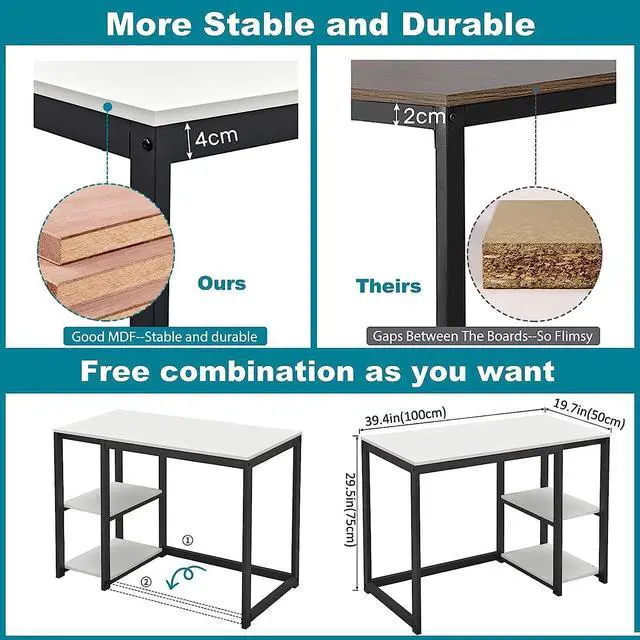 Diverse Storage Design 40 inch Small desks for small spaces has 2 tiers of shelves gives you more storage space, and maximize your desktop space. If you need space in a large computer case, you can always remove the middle shelf to free up more space and turn it into your very own computer gaming desk.