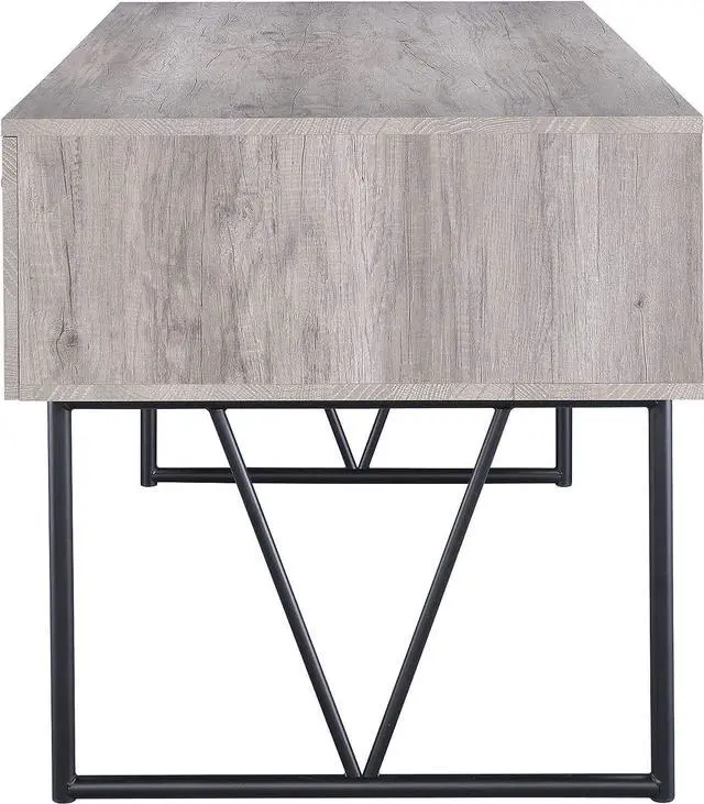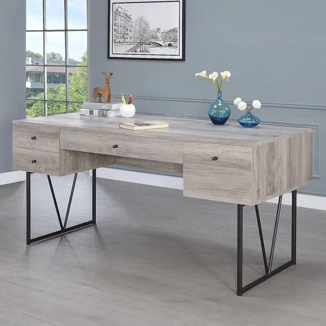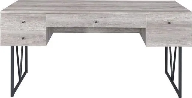 This industrial writing desk has a wide desk top and plenty of storage for when productivity calls