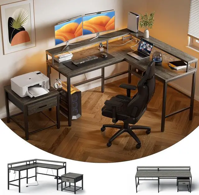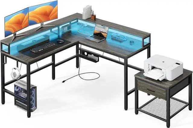 Separate Printer Stand The L shaped gaming desk includes a separate printer stand that can hold up to 99 lbs, the printer rack can be used for printers of most size commonly seen on the market. With a spacious drawer and open storage shelf on the bottom, the printer stand is ideal for storing A4 paper and office supplies near your main desk, ensuring everything you need is within arm' s reach.