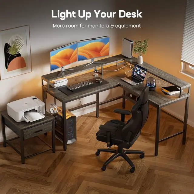 Customizable LED LightingThe Marsail L shaped computer desk features an LED light strip with IR remote control to illuminate your workspace, and match your favorite color to make you work more focused. Attach the light strip underneath the monitor riser and choose from 4 dynamic modes, 16 color options, and adjustable brightness to suit your style. You can better immersion in game modes and create a cozy ambiance.