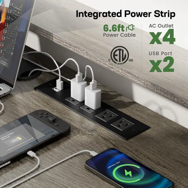 Integrated Power StripOur home office corner desk is equipped with an ETL-listed power strip to keep your devices fully powered. With 4 AC outlets and 2 USB ports built into the desktop, its super easy to plug in and charge your laptop, phone, or tablet without searching under the computer desk for an outlet.