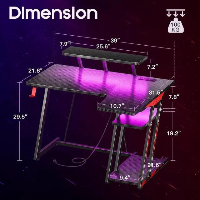 LED Strips Lights & Power Outlets: MOTPK LED gaming desk developed high-quality LED Strips to bring gamers the best gaming accessories: multi-color, multi-mode, and anti-fire. Our PC gaming desk includes a built-in socket with 2 outlets & 2 USB Ports to charge your devices for small space.