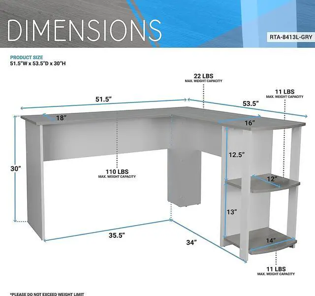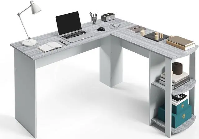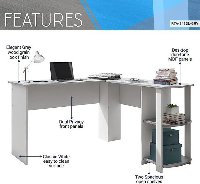 ADD ELEGANCE TO YOUR OFFICE: This classy L shaped office desk is crafted from wooden panels and a laminated surface with a woodgrain grey desk finish. The warm and weathered look of this corner computer desk creates an attractive addition to any room.