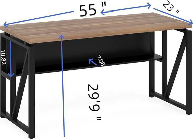 Large 55 computer tableThe large 55" X 24" x 30 (L *W*H) desk top big enough for your laptop, second monitor, a lamp, and some writing space to spread out and get work done. A wide Storage shelf under the desktop, provide extra space for your books or office stuf